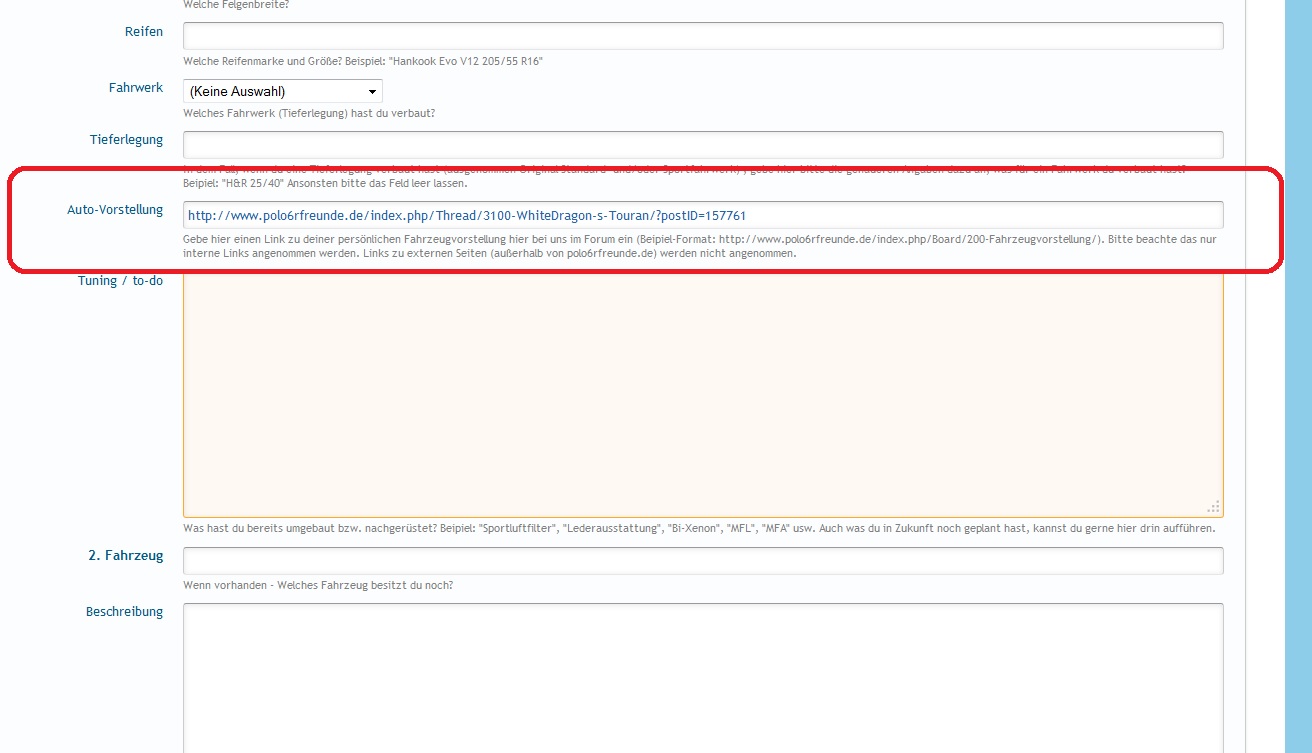 seit heute gibt es mal wieder ein kleines Update, welches ich die letzten Wochen extra eigens wieder für unser Forum entwickelt habe und zwar ist es das Car-Icon bzw. Auto-Vorstellung im eigenen Profil. Einfach den Link im eigenen Profil zur eigenen Fahrzeugvorstellung eintragen und das ganze wird dann automatisch wieder in der Seitenleiste unter dem Avatar in Beiträgen angezeigt. ![]()